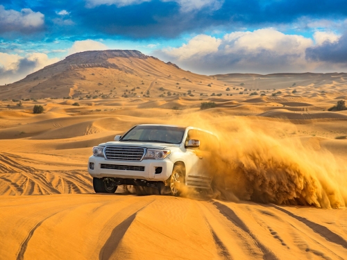 15h30: Xe chuyên dụng Land Cruiser đón đoàn tại khách sạn, bắt đầu hành trình khám phá sa mạc đặc sắc nhất Dubai: