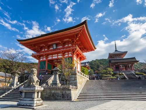 Chùa Thanh Thuỷ - Kiyomizu Dera: Một trong những ngôi đền linh thiêng nhất của xứ sở hoa anh đào với lối kiến trúc độc đáo hoàn toàn bằng gỗ, nằm trên vùng cao ngọn đồi Higashiyama. Toà nhà chính được thiết kế trông giống như 1 kho báu của quốc gia, được nâng đỡ bởi 139 chiếc cột cao 15m. Chùa Kiyomizu được UNESCO công nhận là Di sản Văn hoá năm 1994